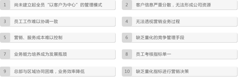 客户关系管理的第一需求就是对客户资源的集中管理,即为客户资源的企业化管理,可以避免因业务调整或人员变动造成的客户资源流失和客户管理盲区的产生;更重要是可以基于客户状况来归集相关业务信息,通过完善的信息来支持业务角色的工作,同时达到对业务阶段和行动的监控指导。这也是CRM对企业带来的核心变化。